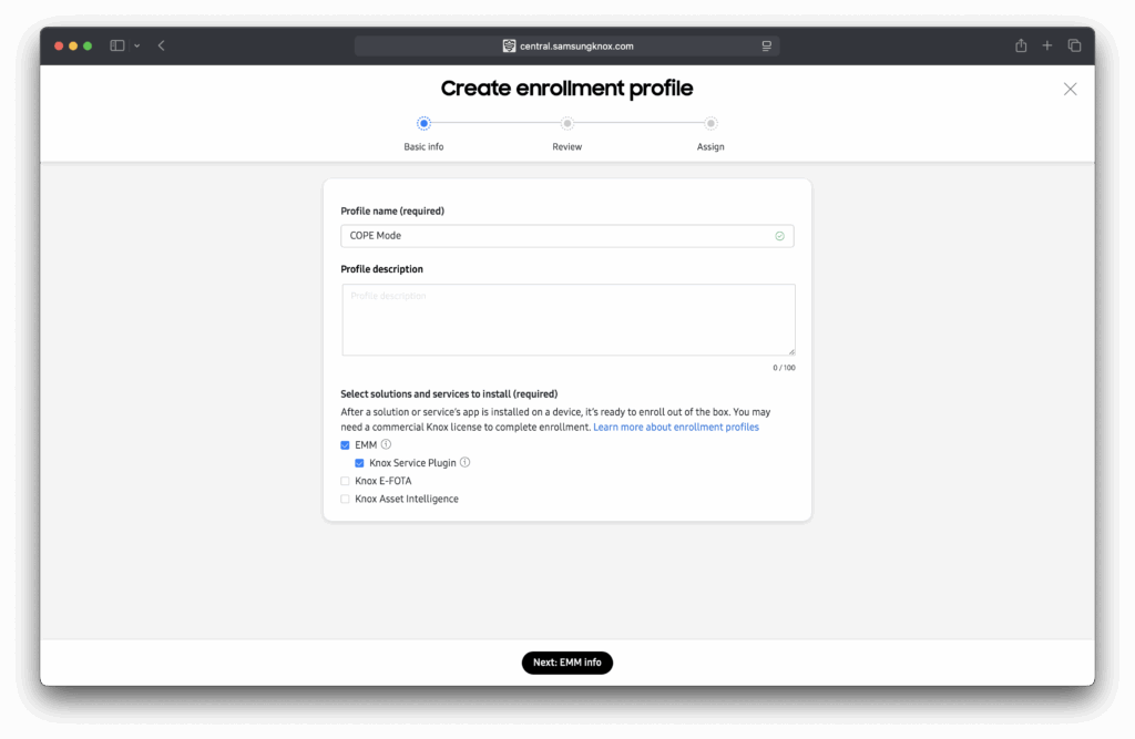 Name the profile according to the deployment type (DO, COPE, Dedicated, etc.) and select the EMM checkbox and optionally Knox Service Plugin. Then, click Next.