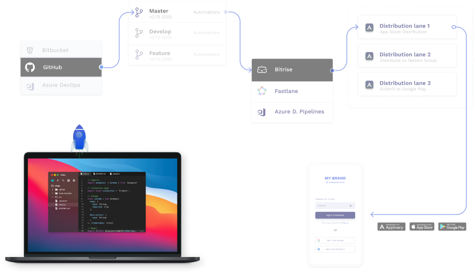 En Applivery creamos un puente directo y automatizado. En lugar de enviar archivos .apk o .ipa manualmente, tu equipo puede integrar Applivery directamente en sus flujos de Integración Continua (CI/CD). Con cada nuevo commit, una nueva versión de la app puede aparecer en la plataforma —casi por arte de magia— lista para ser distribuida. Esto permite: