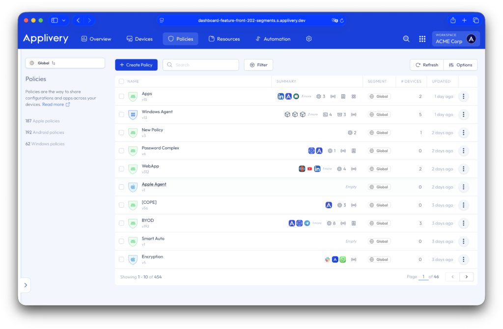 La sección de Políticas lista todas las políticas disponibles en tu cuenta. Al igual que con los dispositivos, la visibilidad y el acceso a políticas depende de los permisos de segmento del workspace. Desde aquí, los administradores pueden crear nuevas políticas o modificar las existentes.