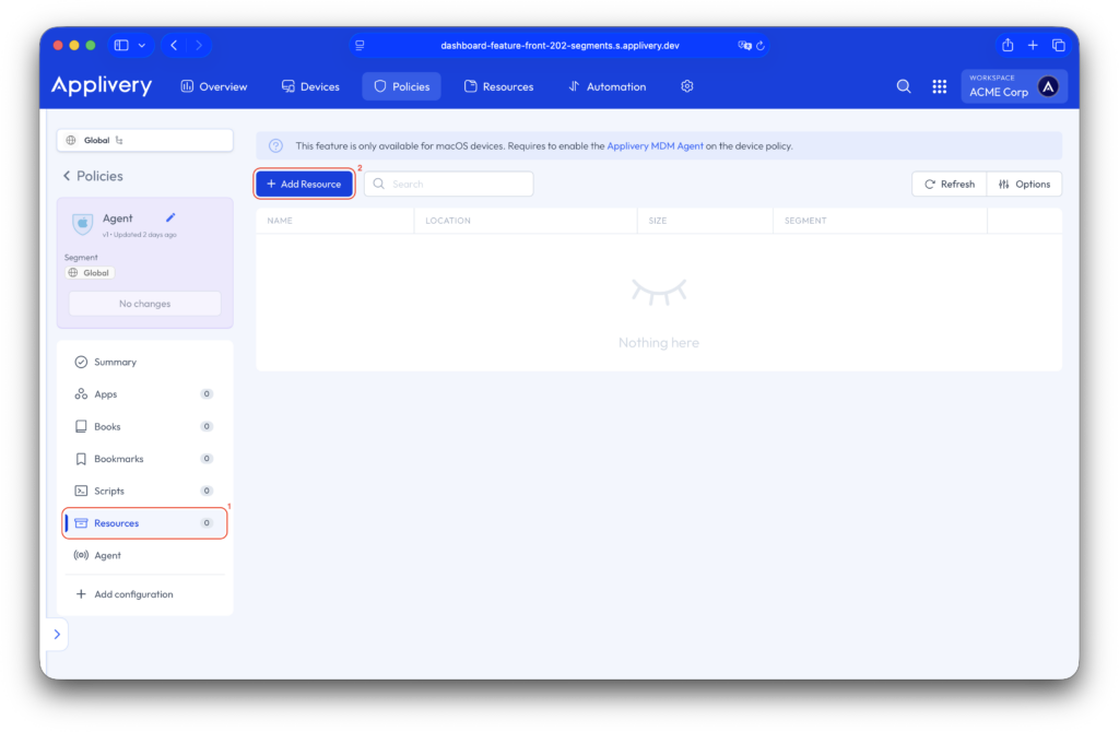 Dentro del panel de Applivery, navega a Políticas. Selecciona la política a la que deseas añadir el recurso. A continuación, desde el menú lateral izquierdo, haz clic en Recursos (1) y selecciona el botón + Añadir Recurso (2) para comenzar el proceso.
